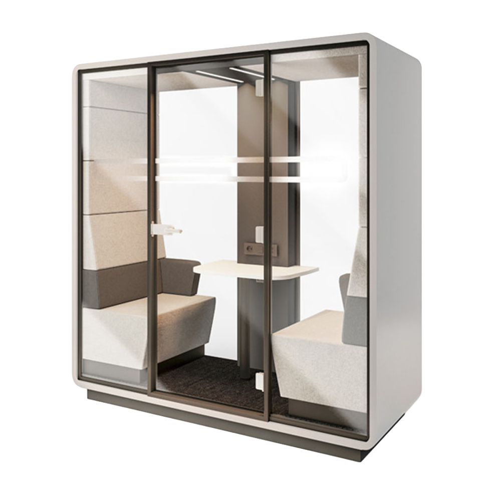 De hushMeet.S is een akoestische overlegplek voor op kantoor. De kantoorcabine is B-label gecertificeerd (ISO 23351-1:2020) en beschikt over een uitstekende geluidsisolatie. De akoestische ruimte is een 2-persoons model en is perfect geschikt voor effectieve één-op-één gesprekken.
